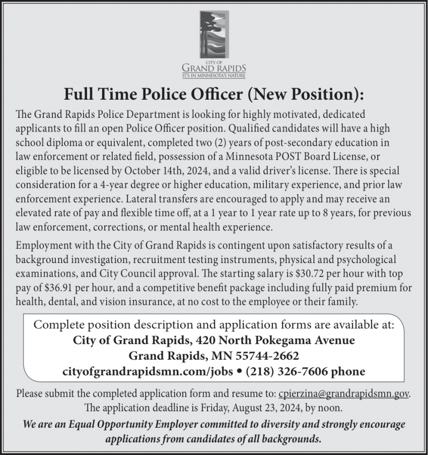 Aug 14, 2024. City of Grand Rapids Police Jobs from Minnesota State Jobs