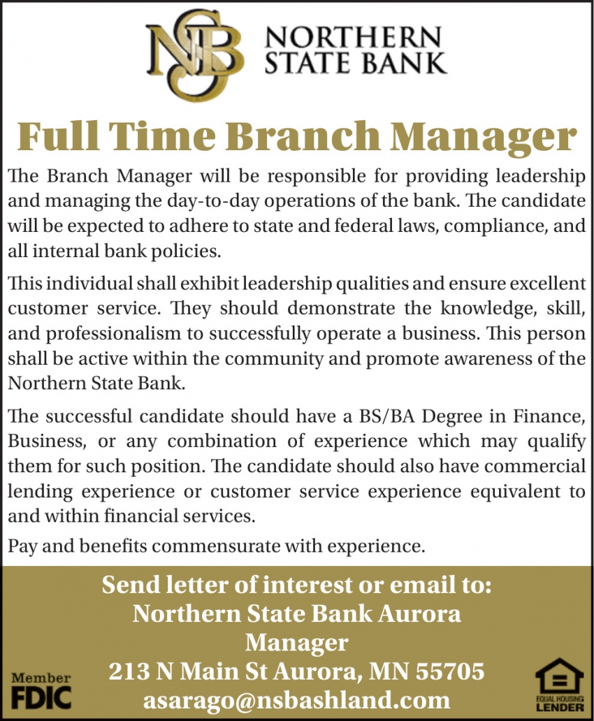 Mar 15, 2025. Northern State Bank-Aurora Manager / Supervisor Jobs from Minnesota State Jobs