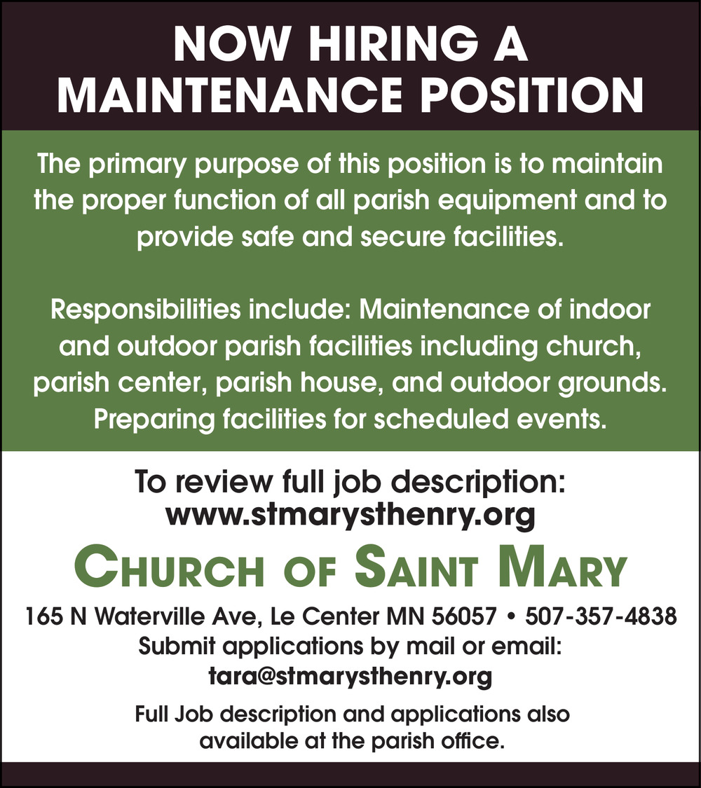 Sep 30, 2025. Church of Saint Mary Maintenance Jobs from Minnesota State Jobs