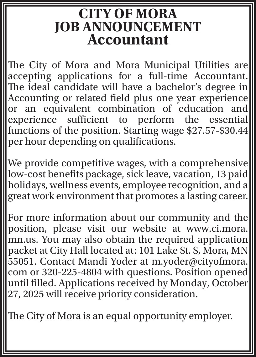 Oct 08, 2025. City of Mora Accounting Jobs from Minnesota State Jobs