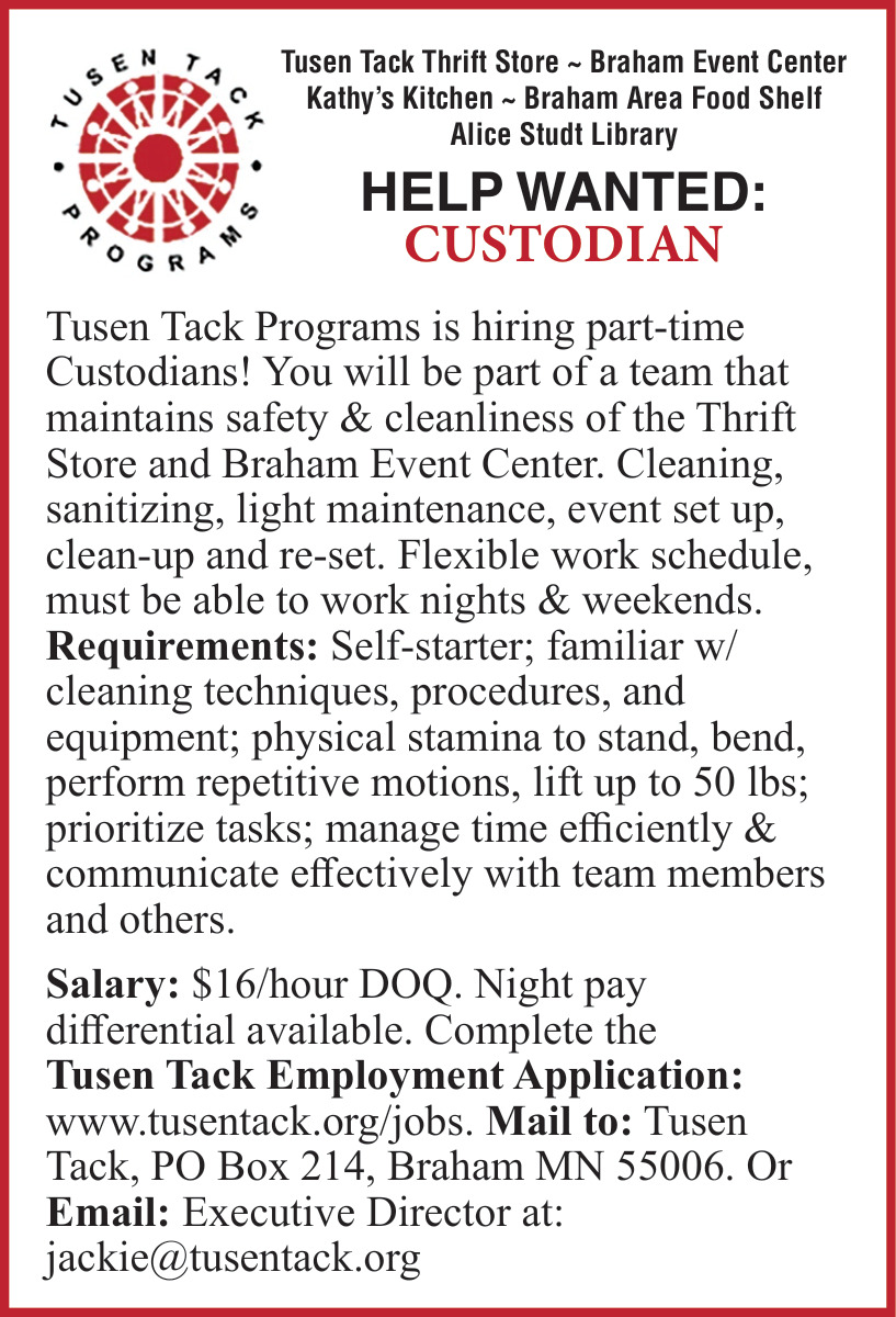 Jobs for Tusen Tack in Braham, MN