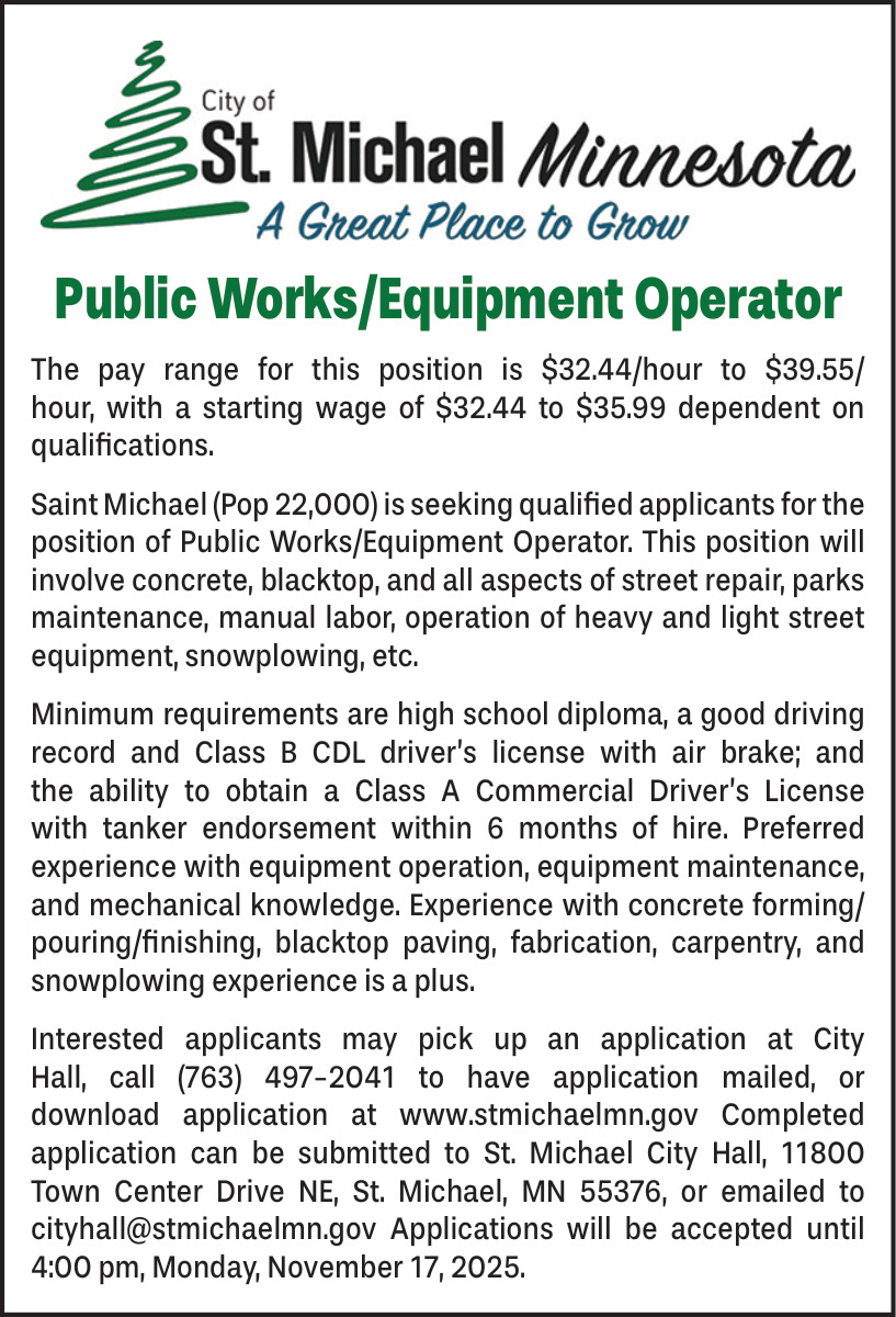 Oct 29, 2025. City of St. Michael Government Jobs from Minnesota State Jobs