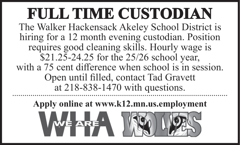 Dec 24, 2025. Walker Hackensack Akeley School District Custodian Jobs from Minnesota State Jobs