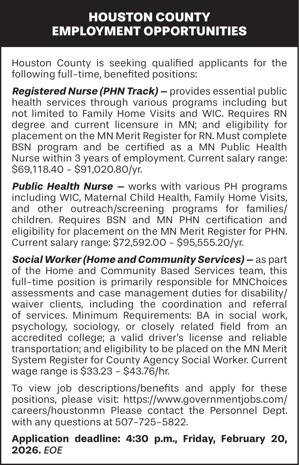 Feb 04, 2026. Houston County Government Jobs from Minnesota State Jobs
