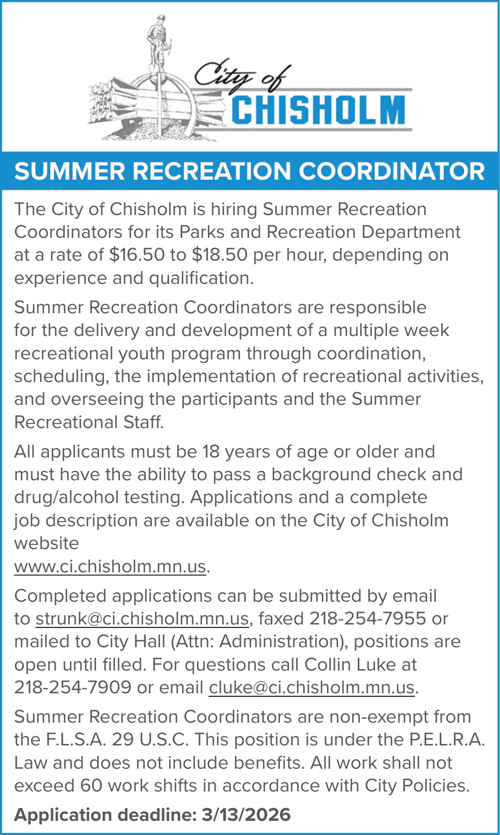 Summer Recreation Coordinator Job Openings in Chisholm, MN