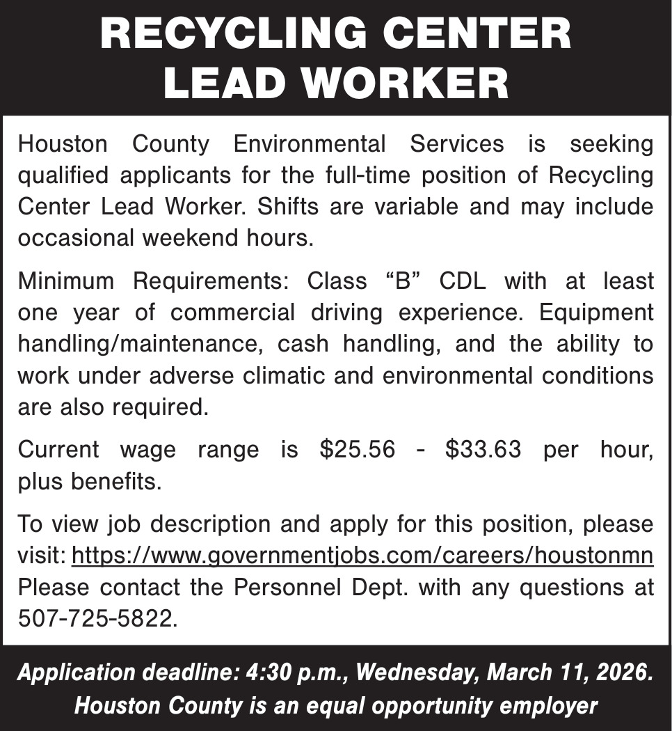 Feb 20, 2026. Houston County Environmental Services Government Jobs from Minnesota State Jobs