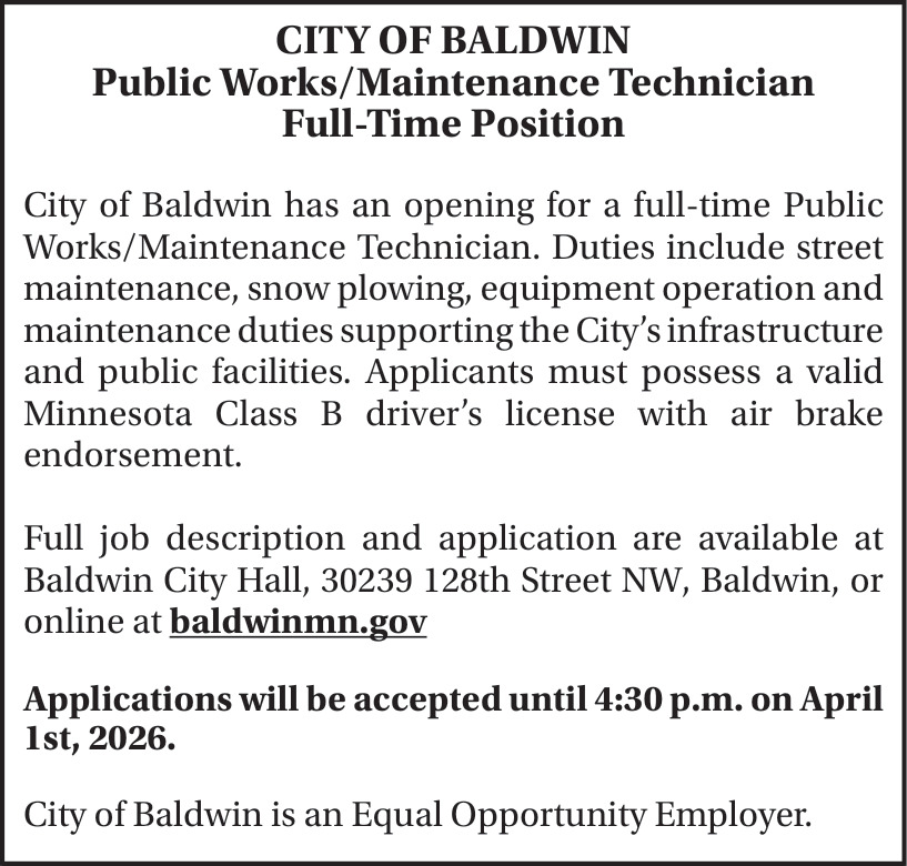 Feb 26, 2026. City of Baldwin Government Jobs from Minnesota State Jobs