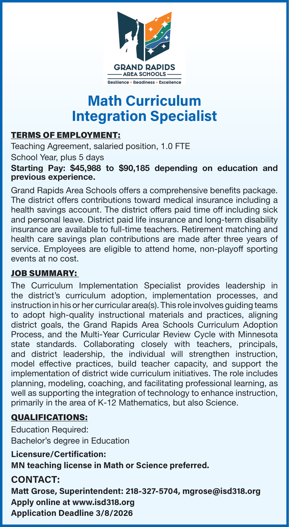 Mar 01, 2026. Grand Rapids Area Schools General Jobs from Minnesota State Jobs