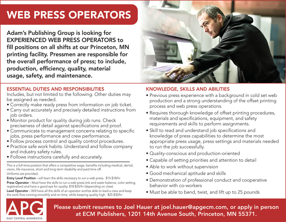 Web Press Operator Position Available in Princeton, MN