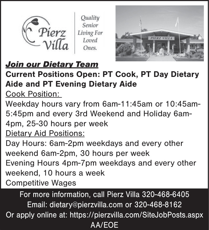Apr 05, 2026. Pierz Villa Cooks & Chefs Jobs from Minnesota State Jobs