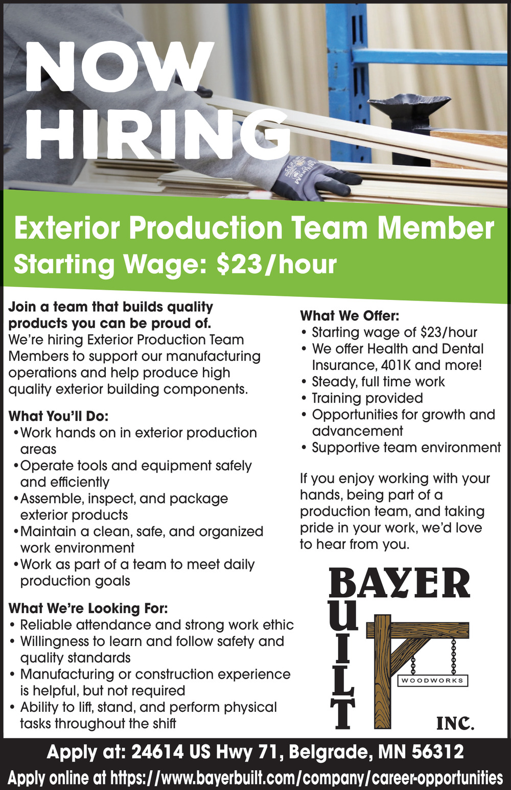 Jobs for Bayer Built, Inc in Belgrade, MN