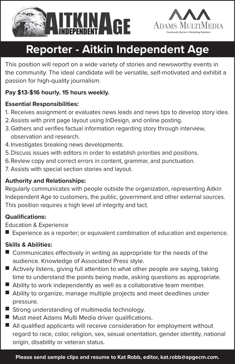 Apr 13, 2026. Adams Multimedia Reporter Jobs from Minnesota State Jobs