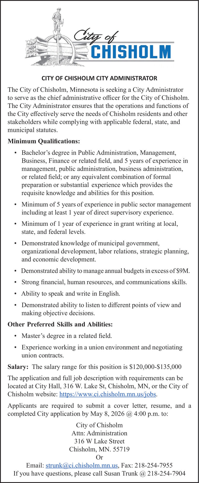 City Administrator Job Opening in Chisholm, MN