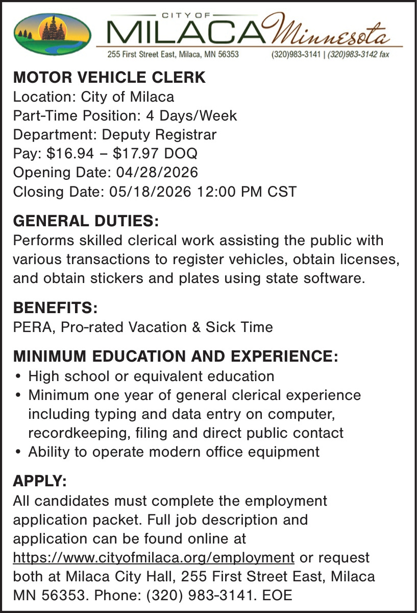 Motor Vehicle Clerk Job Opening in Milaca, MN