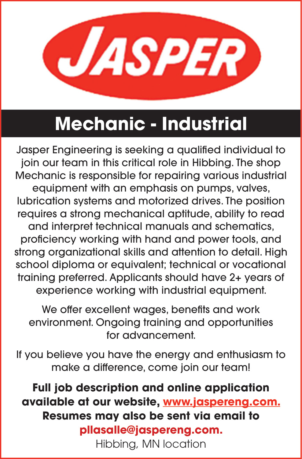 Apr 30, 2026. Jasper Engineering Mechanic Jobs from Minnesota State Jobs